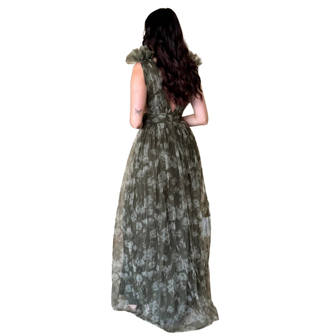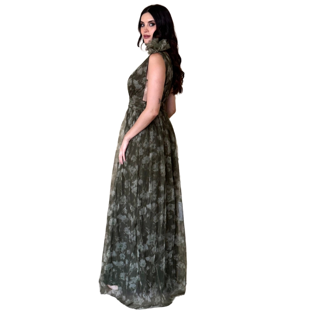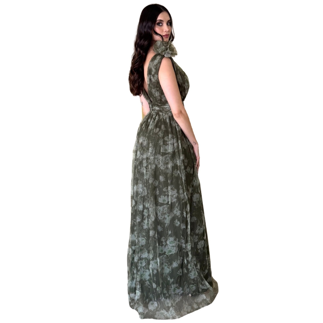 Detalles: fondo ivory, tela vaporosa, tul con estampado fucsia, cierre invisible en espalda, abertura en pierna, moños en hombros