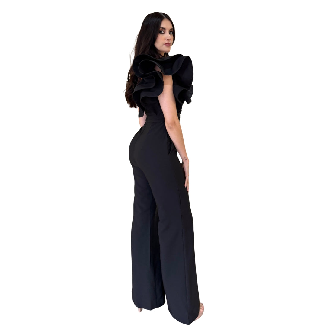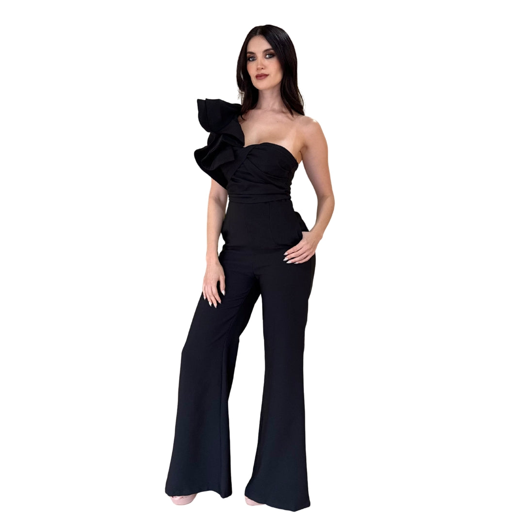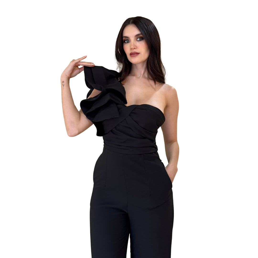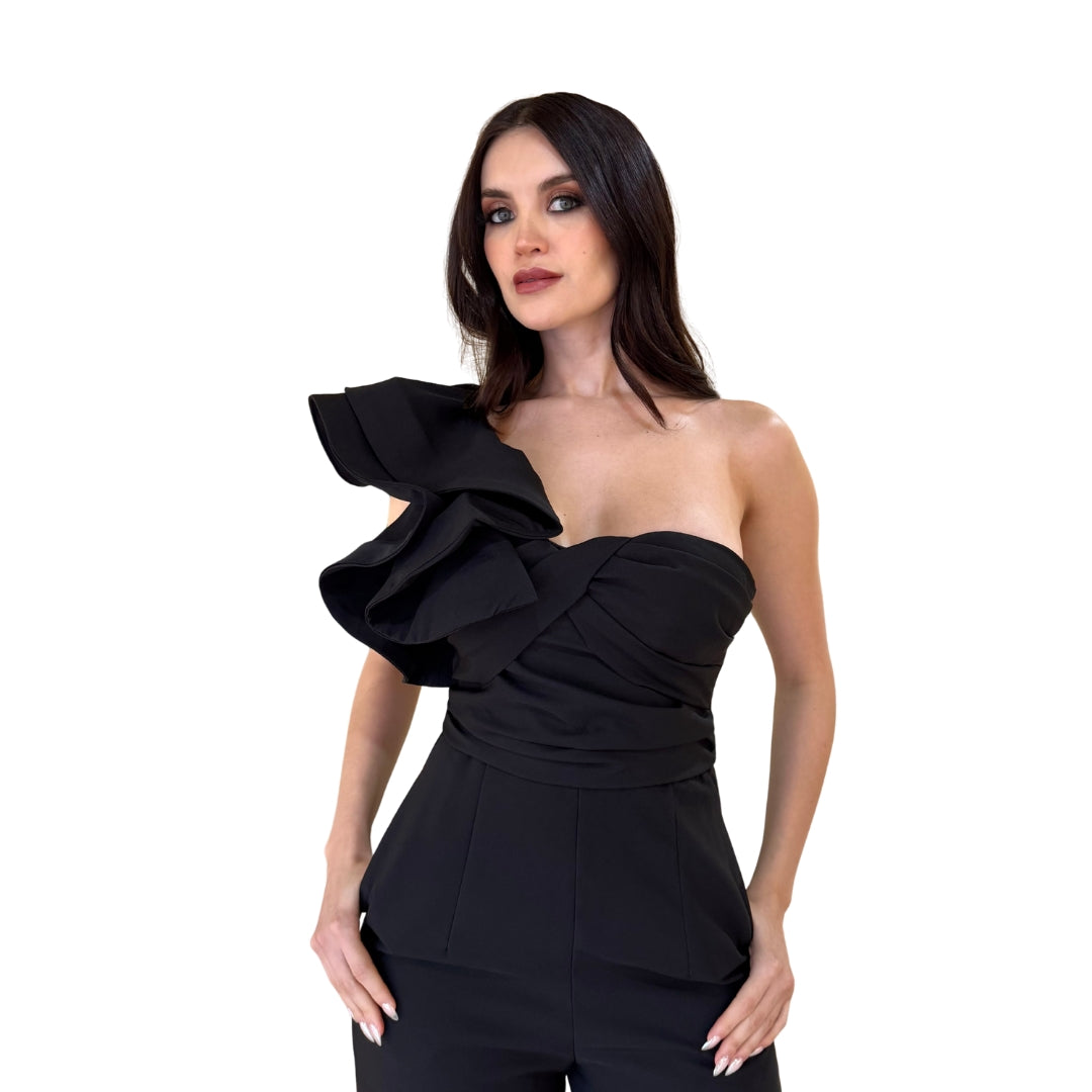 Detalles: bolsas a los costados, olan asimétrico en top, pinzas al frente, cierre invisible en espalda