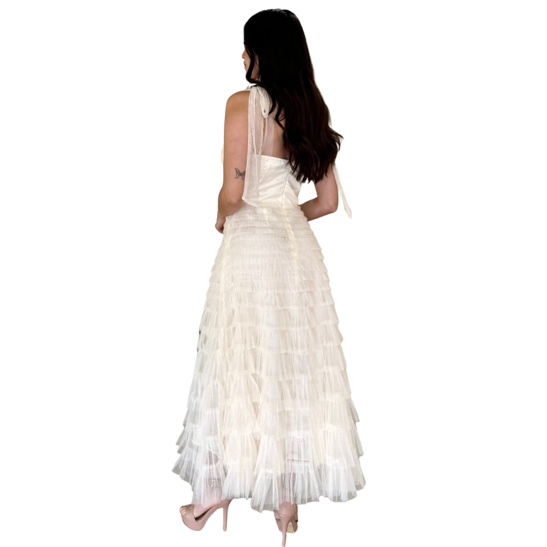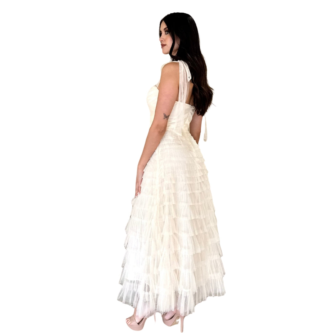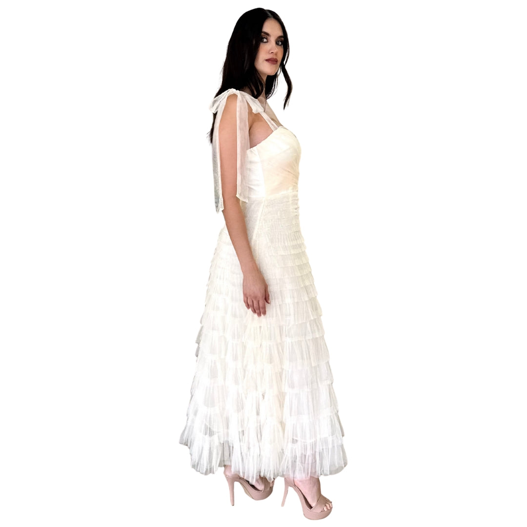 Detalles: tela de tul con acabado plisado en falda y drapeado en top, moños ajustables en hombros, cierre invisible en espalda
