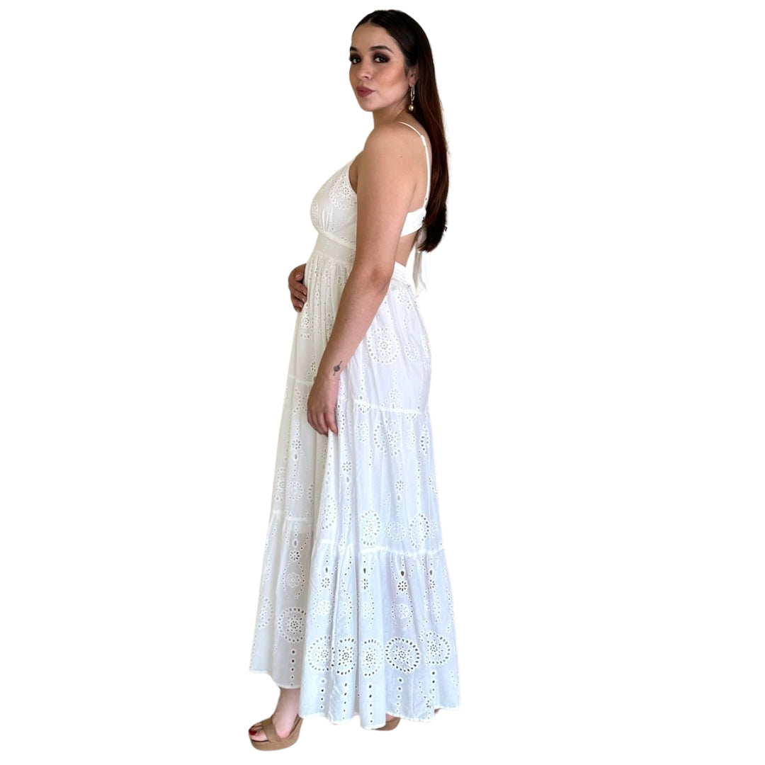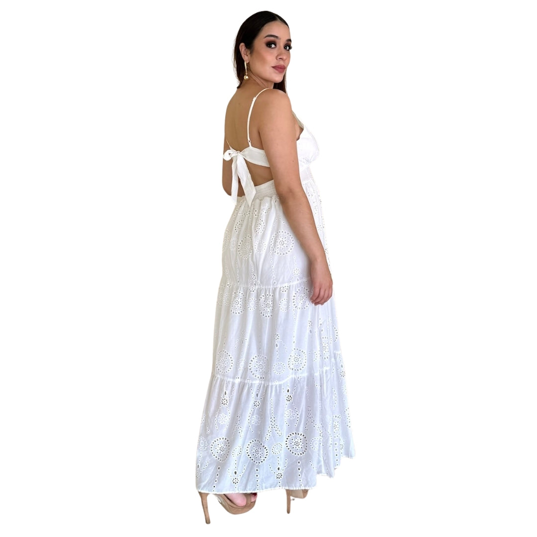 Detalles: tela fresca, resorte en cintura, escote en espalda, cinta ajustable en espalda, tirantes ajustables, bordado inglés