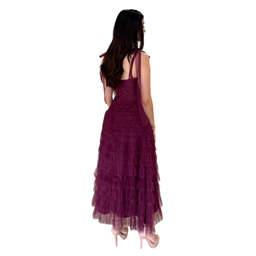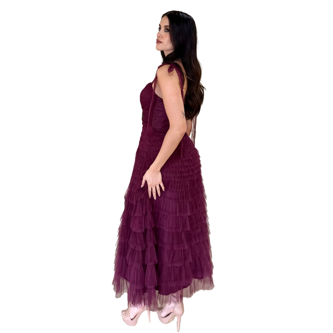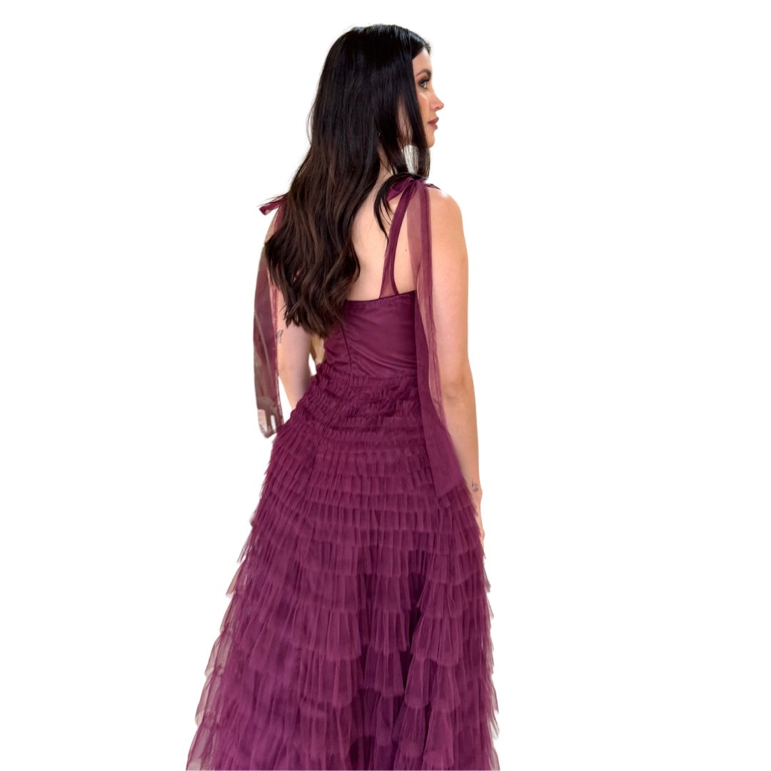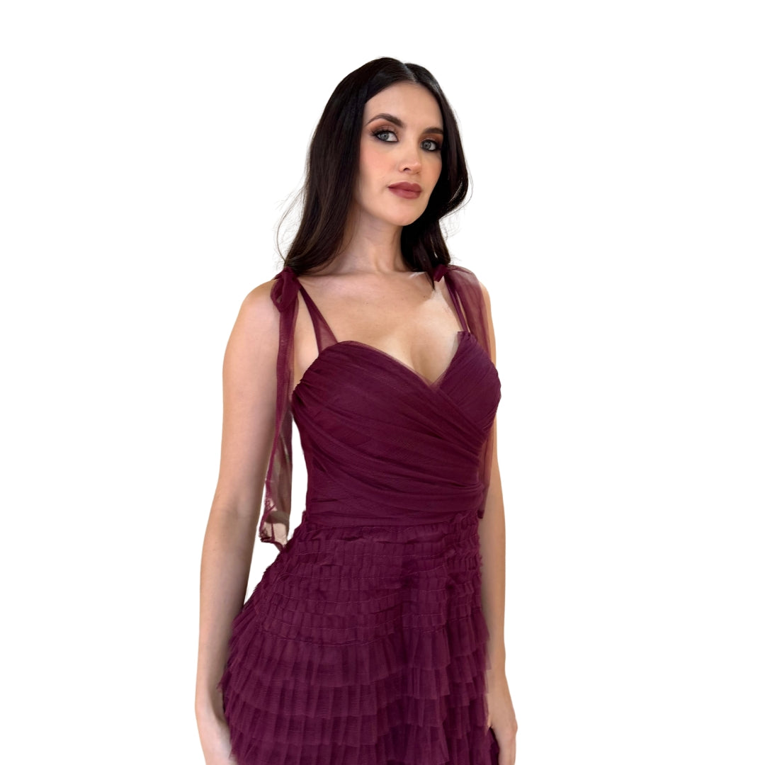 Detalles: tela de tul con acabado plisado en falda y drapeado en top, moños ajustables en hombros, cierre invisible en espalda