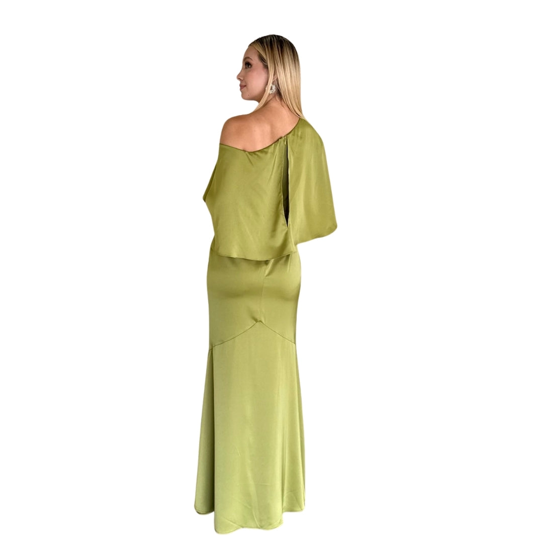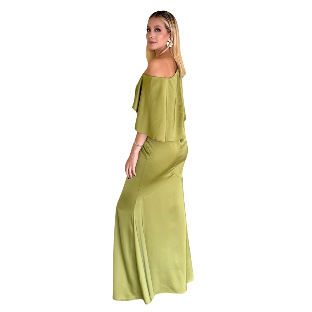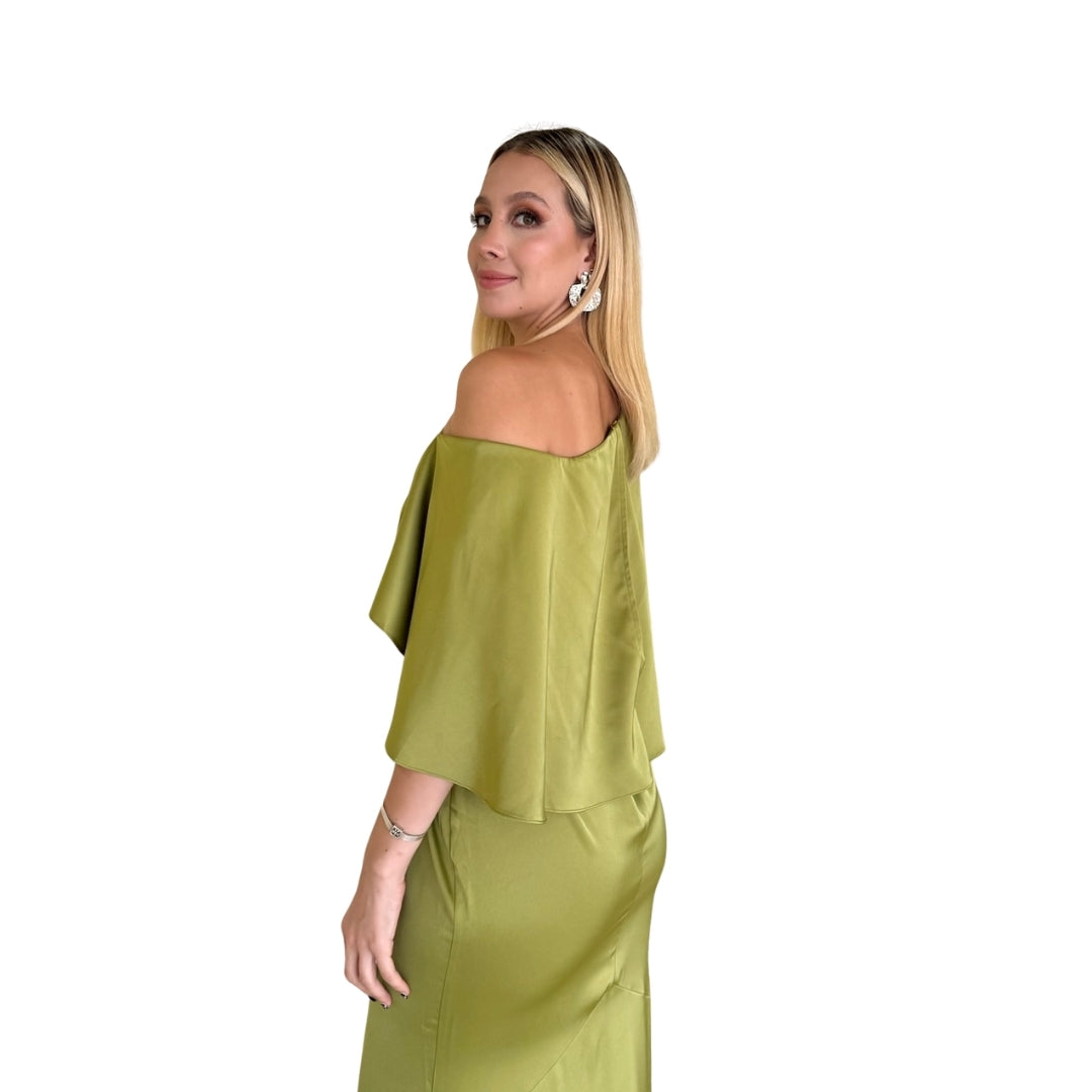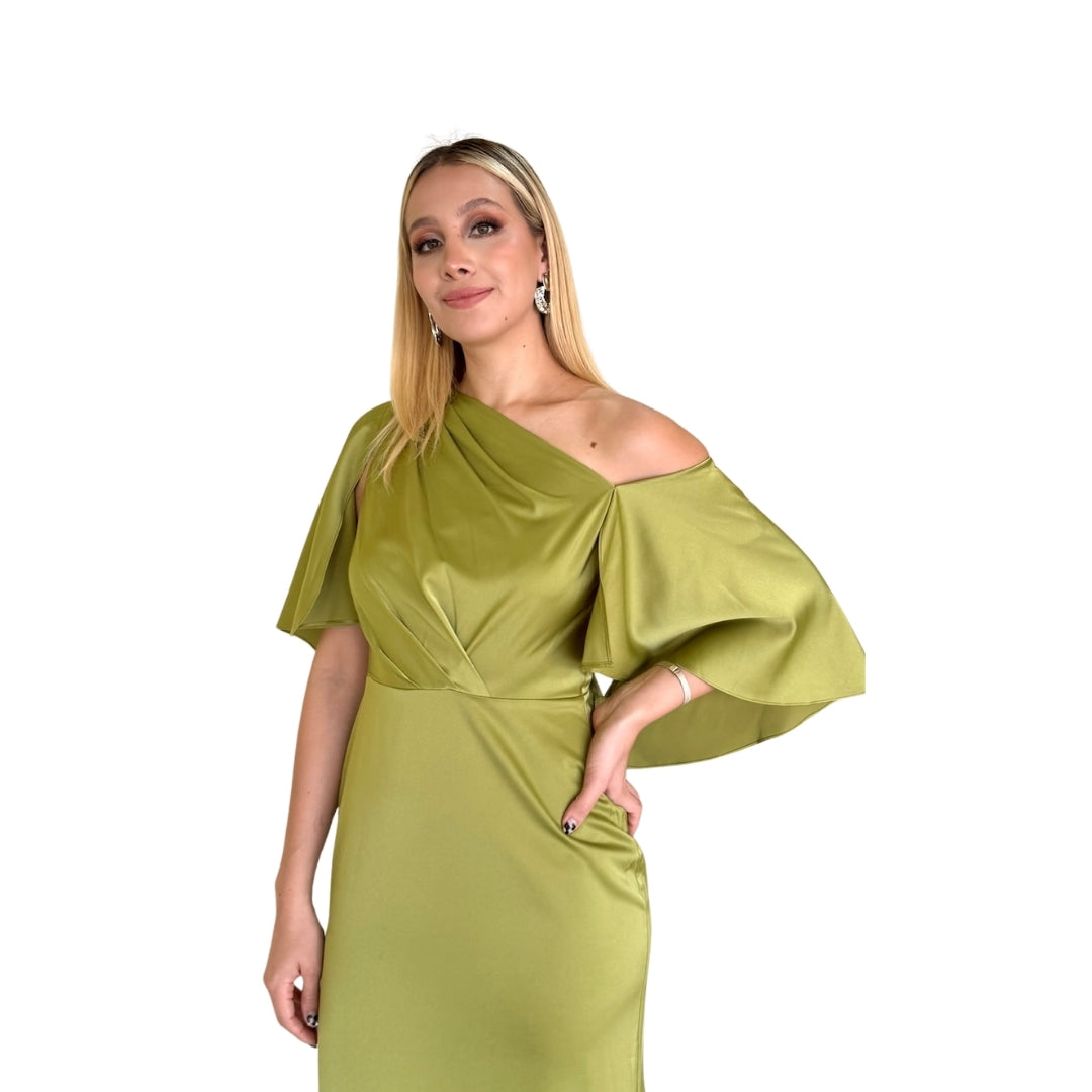Detalles: tela satinada, capa que cubre brazos con abertura en espalda, drapeado en top, cierre invisible en espalda