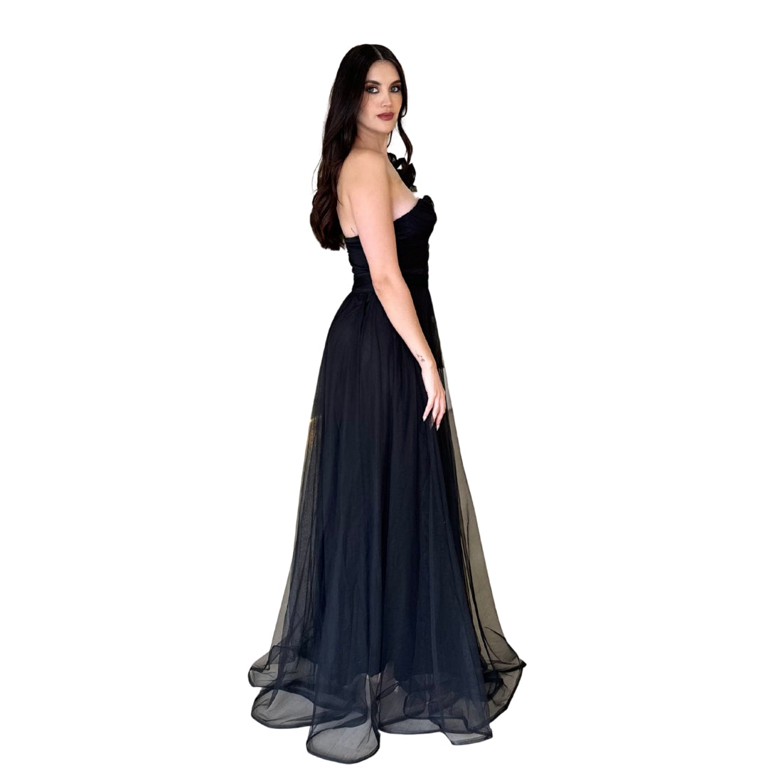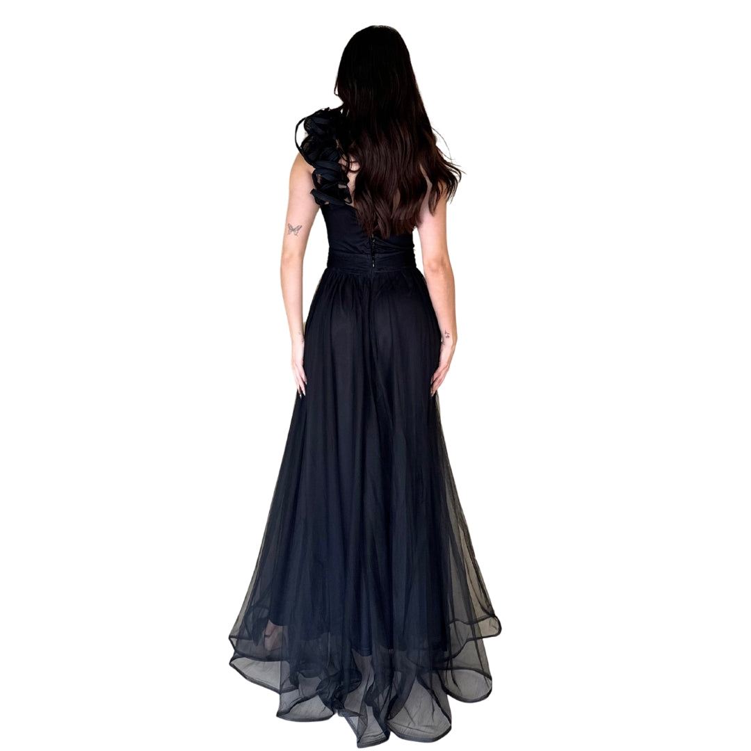 Detalles: top drapeado, tul con estampado multicolor, olan en hombro, espalda tipo corset, cierre invisible en espalda