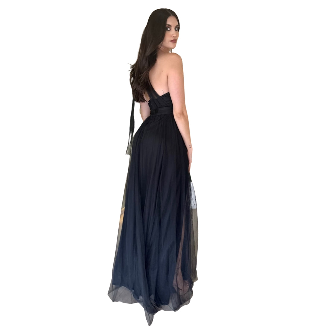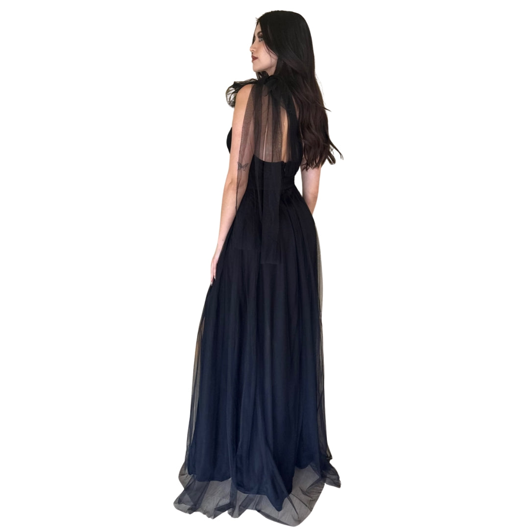 Detalles: top bustier, falda de tul con. aberturas, cierre invisible en espalda, tul asimétrico con moño ajustable