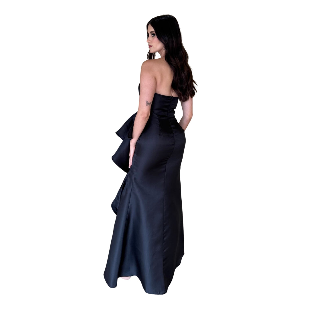 Detalles: tela con acabado de satinado, abertura en falda, detalle de olan asimétrico en vestido, cierre invisible en espalda