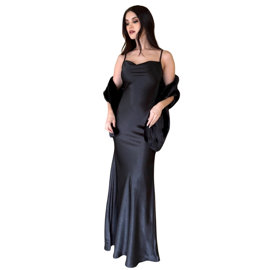 Georgia | Vestido largo satín con estola de peluche negro