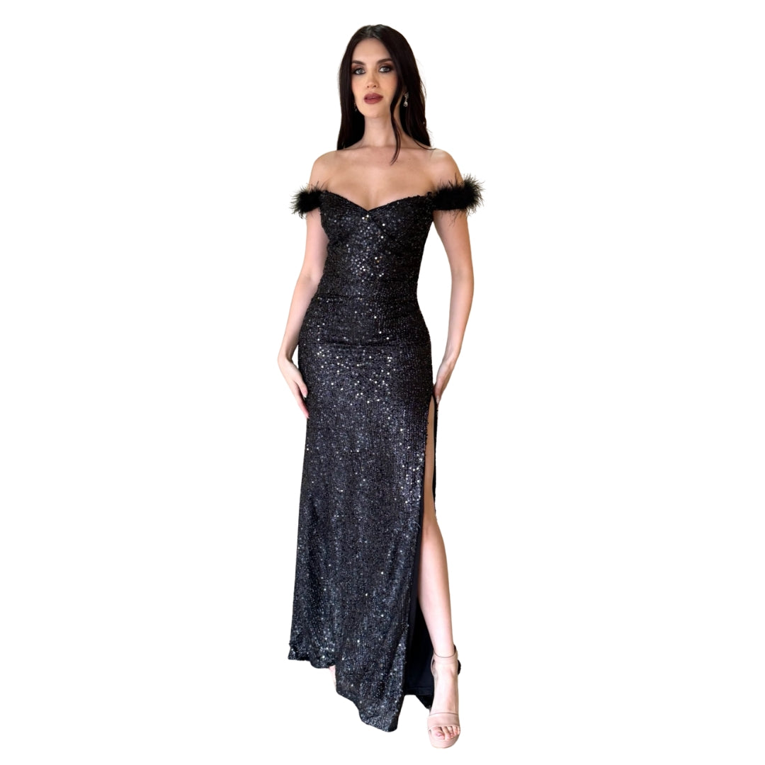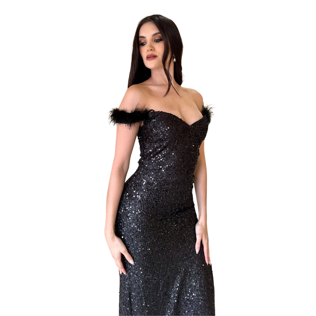 Greta | Vestido largo lentejuelas y plumas negro