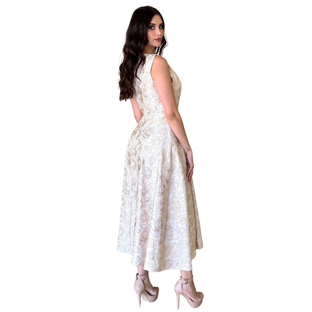 Fiorela | Vestido midi diseño 3D flores metálico dorado