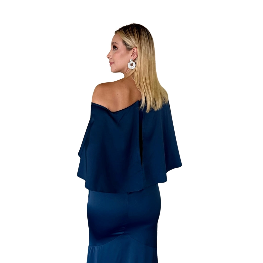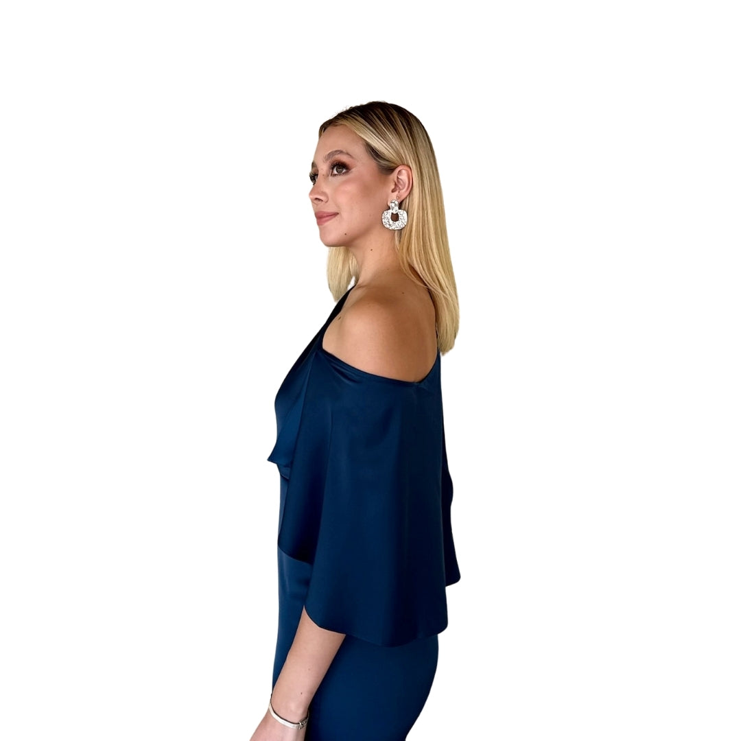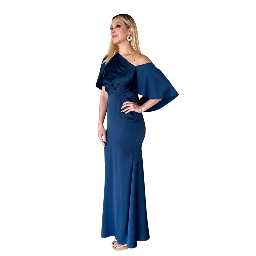 Detalles: tela satinada, capa que cubre brazos con abertura en espalda, drapeado en top, cierre invisible en espalda
