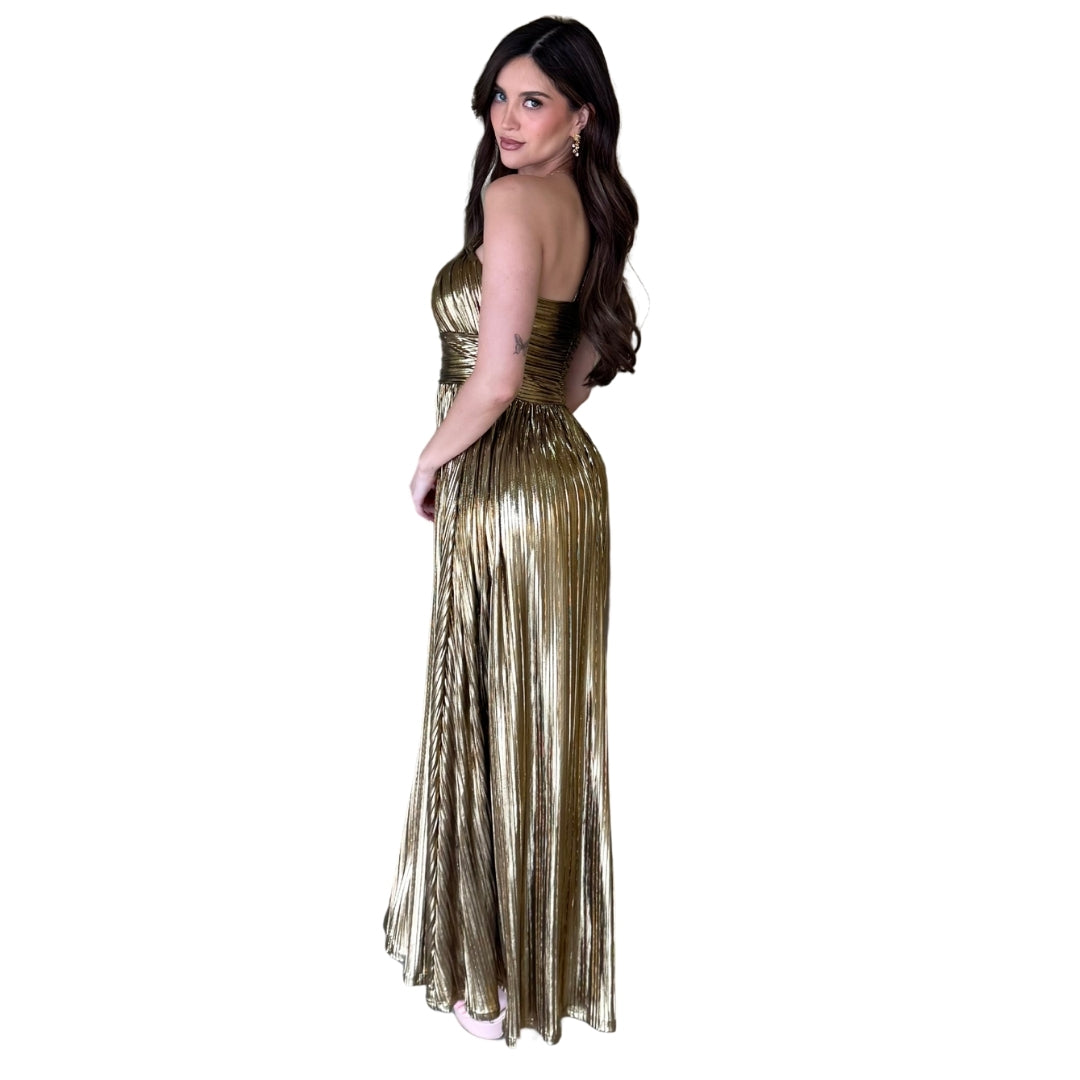Isolde | Vestido largo plisado metálico dorado